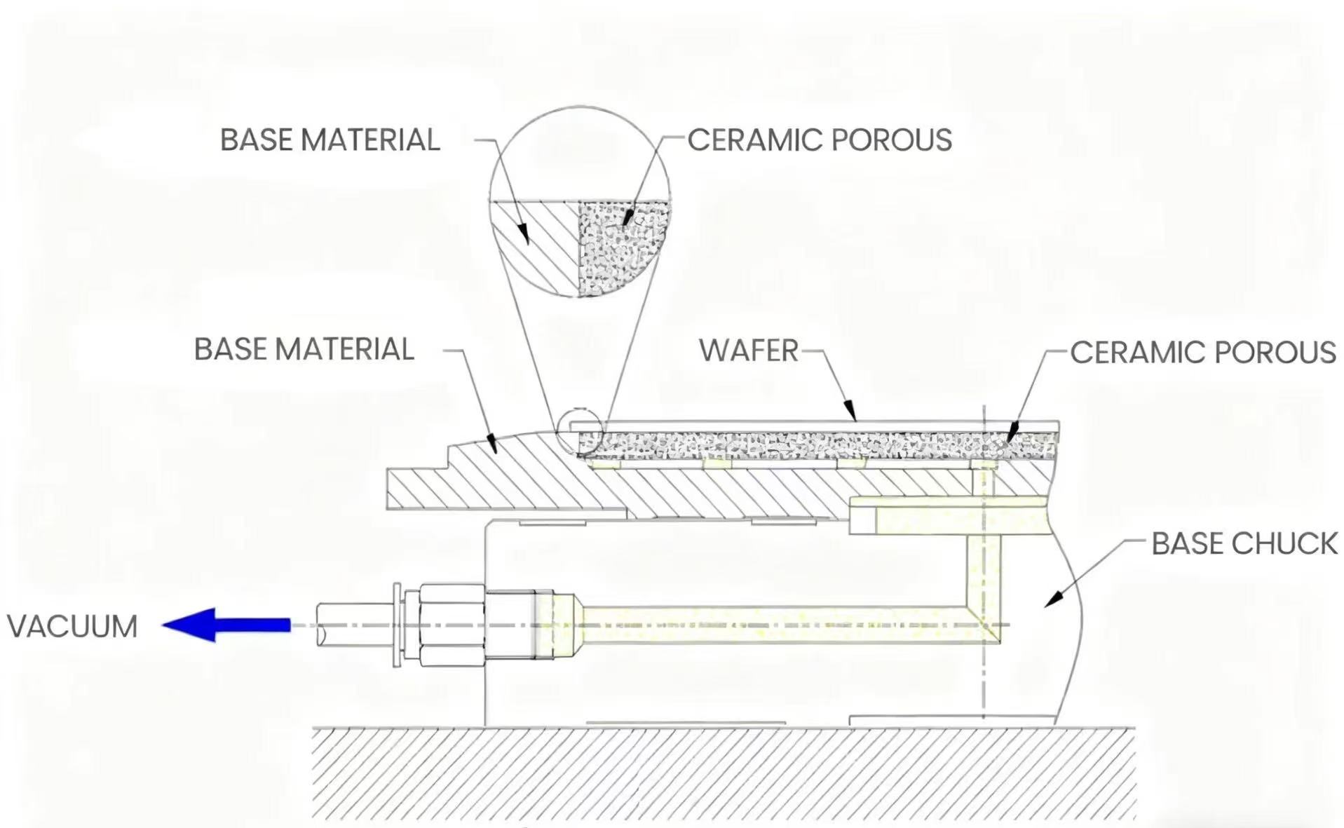 Personalizatmandrina ceramica poroasacuprinde baza si placa ceramica poroasa. Conectarea la un sistem de vid, mediul de joasă presiune este creat prin evacuarea aerului dintre napolitană și ceramică. Sub presiune negativă de vid, napolitana este ferm lipită de suprafața mandrinei, obținând în cele din urmă o fixare și o poziționare sigură și stabilă.