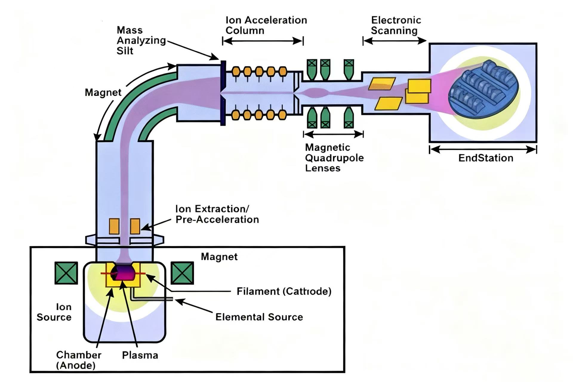 2. Implantarea ionică este tehnica principală de dopaj în fabricarea semiconductoarelor, care are mai multe avantaje, cum ar fi precizia ridicată a dopajului, temperaturile scăzute ale procesului și deteriorarea redusă a materialului substratului. Mai exact, procesul de implantare ionică presupune ionizarea atomilor de impurități pentru a crea ioni încărcați, apoi accelerarea acestor ioni printr-un câmp electric de mare intensitate pentru a forma un fascicul de ioni de înaltă energie. Suprafața semiconductorului este apoi lovită de acești ioni care se mișcă rapid, permițând implantarea precisă cu adâncime de dopaj reglabilă. Această tehnică este deosebit de utilă pentru crearea structurilor de joncțiune de mică adâncime, cum ar fi regiunile sursă și de scurgere ale MOSFET-urilor și permite un control de înaltă precizie asupra distribuției și concentrației impurităților.