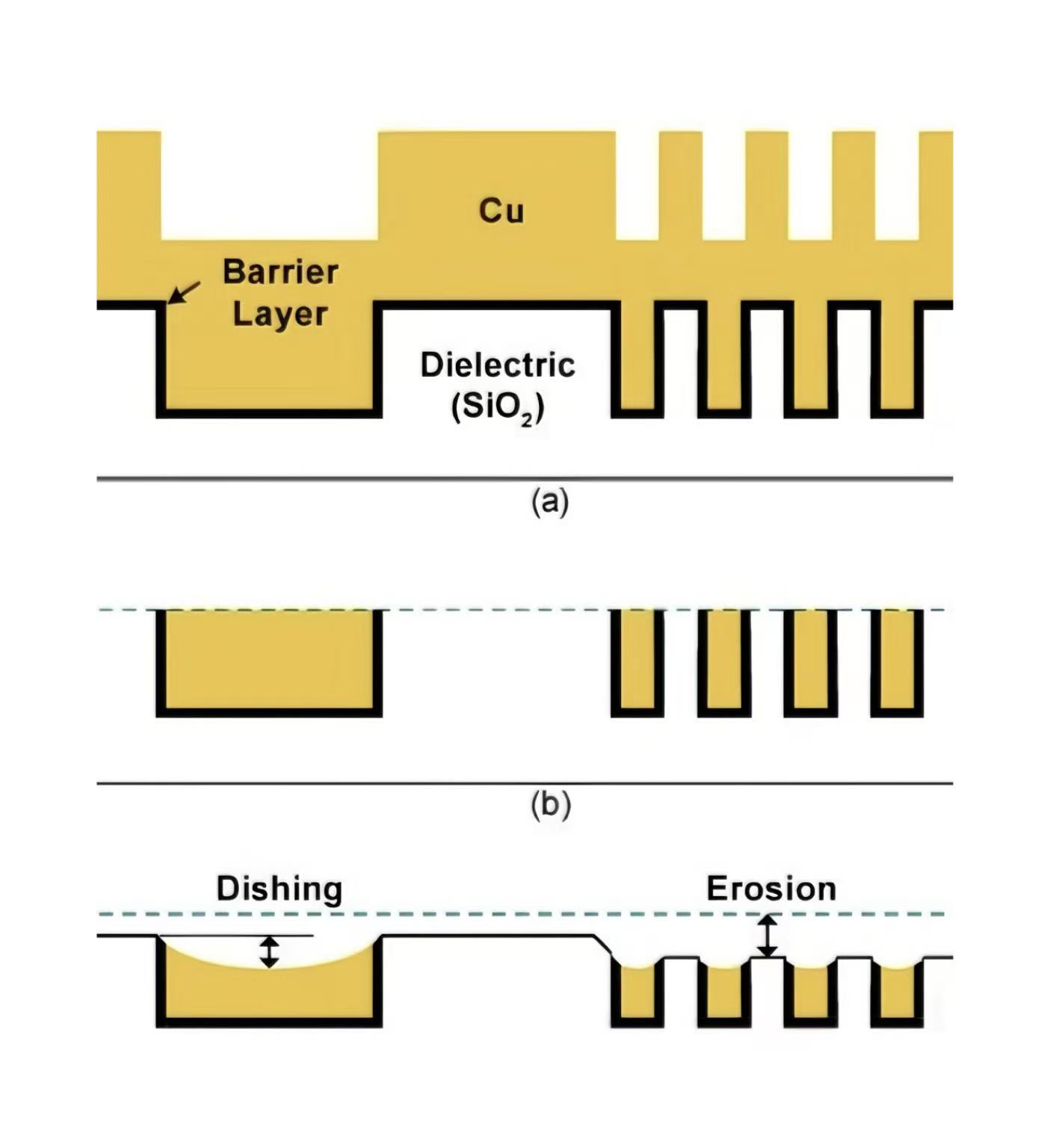 Dishing înseamnă supra-lustruirea materialelor mai moi (cum ar fi cuprul) în timpul procesului CMP, rezultând în depresiuni centrale localizate în formă de disc. Frecvent în liniile metalice largi sau în zonele mari de metal, acest fenomen rezultă în principal din inconsecvențele de duritate a materialului și distribuția neuniformă a presiunii mecanice. Dishingul este caracterizat în primul rând printr-o adâncime în centrul unei linii metalice largi, cu adâncimea adâncimii crescând de obicei odată cu lățimea liniei.
